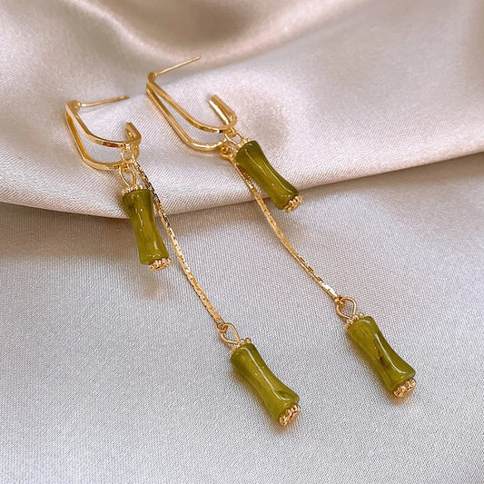 Boucles d'oreilles à pampilles en bambou vert, bijou en plaqué or