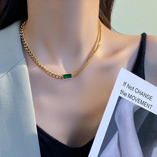 Collier avec cristal vert émeraude, bijou en acier inoxydable plaqué or et en cristal