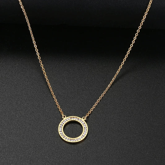 Collier pendentif rond serti de zircons, bijou en acier inoxydable doré