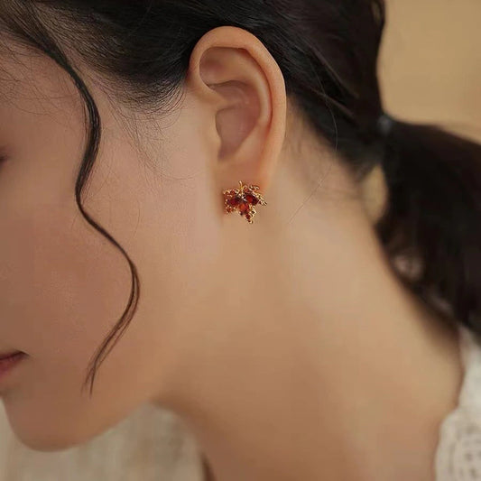 Boucles d'oreilles Feuilles d'érable avec zircons marrons, bijou en plaqué or