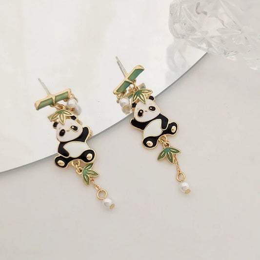 Boucles d'oreilles pendantes Pandas, bambou et perles, bijou en alliage plaqué or 585 (14 ct) et en émail