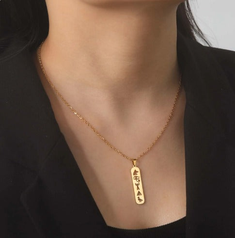Collier avec cartouche d'hiéroglyphes Pyramide, bijou en acier inoxydable doré
