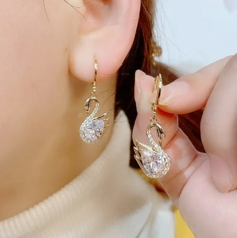 Boucles d'oreilles Cygnes blancs, bijou en alliage plaqué or 585 (14 ct) et en zircons naturels