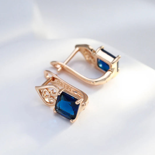 Boucles d'oreilles avec zircons bleu saphir et coeurs arabesques, bijou en plaqué or rose
