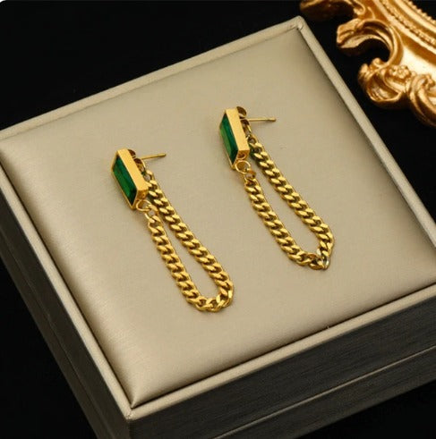 Boucles d'oreilles Rétros avec cristal vert, bijou en plaqué or